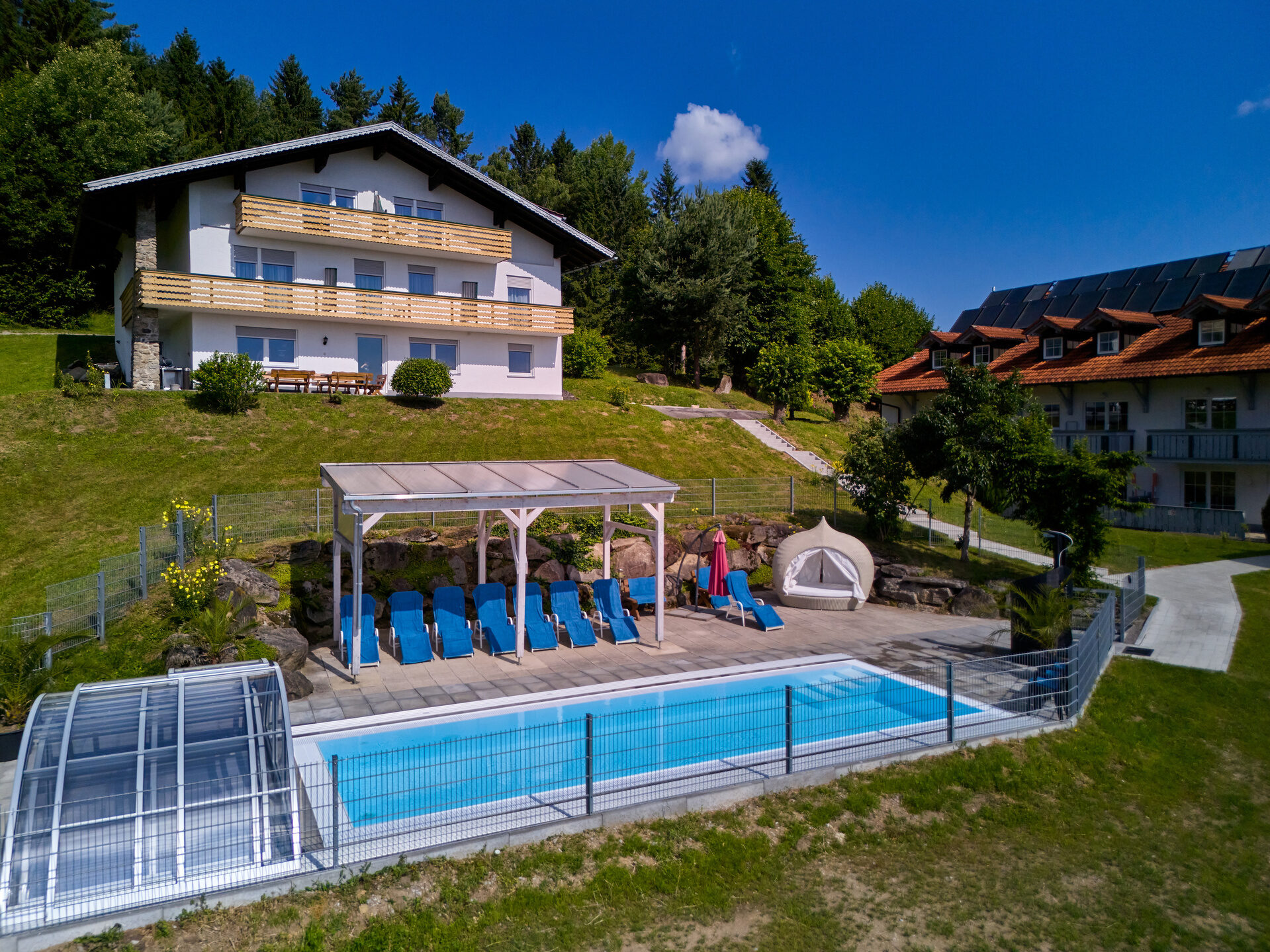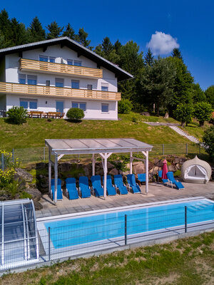 Das großzügige Ferienhaus steht in aussichtsreicher Hanglage beim Richterhof Anwesen. Mit herrlichem Blick ins Kirchaitnach-Tal & Dörfli und auf die Bergkette des großen Arber. Auf Grund der Aufteilung und der separaten Lage eignet sich das Haus gut für Großfamilien und Gruppen.